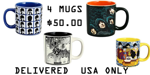 Set of Four Beatles Mugs ALL Different and ONLY $44.00. Share with Co-Workers, Roommates, Family or Friends. Random 4 Selected from current in stock 12-14 oz mugs.